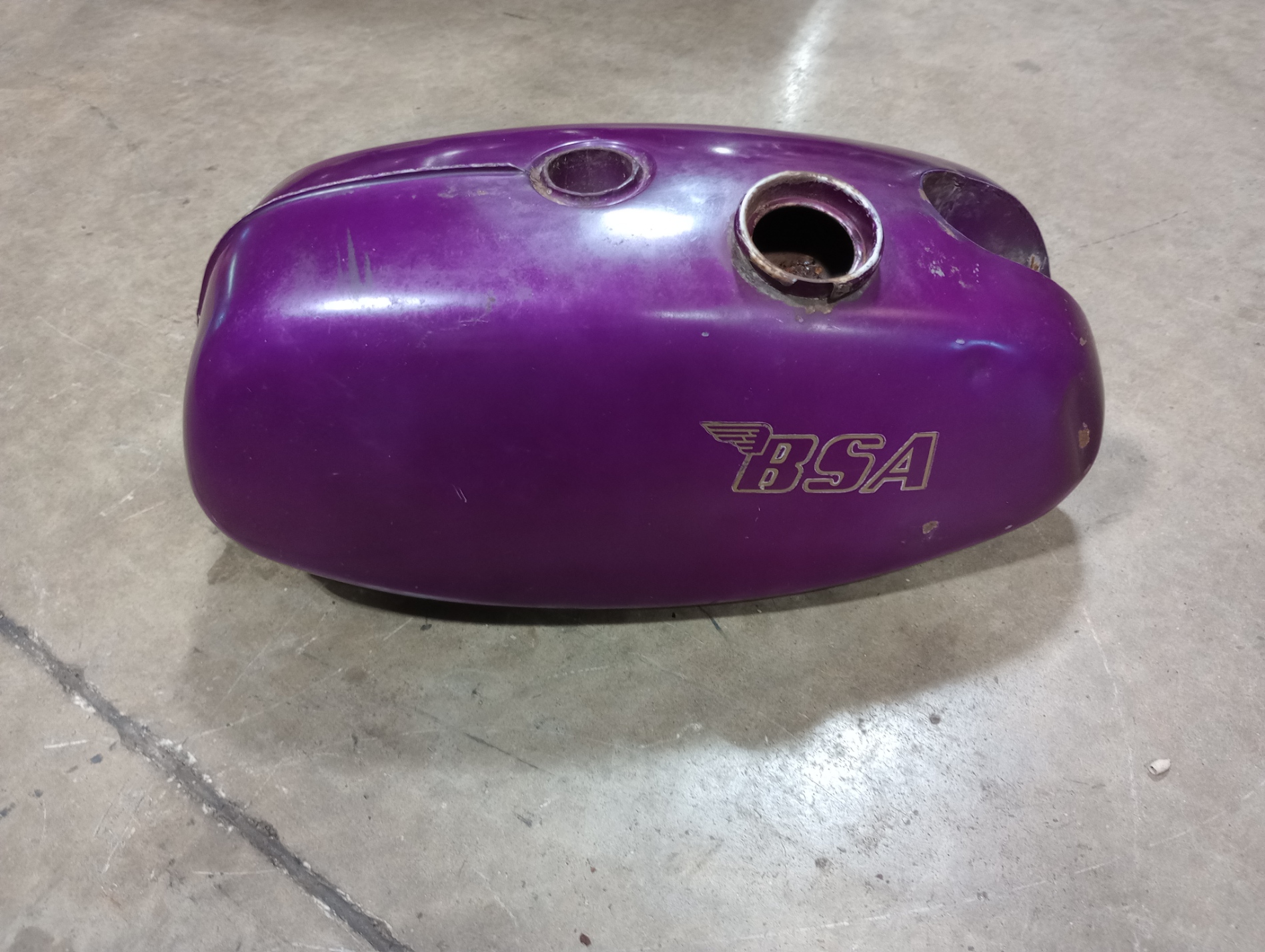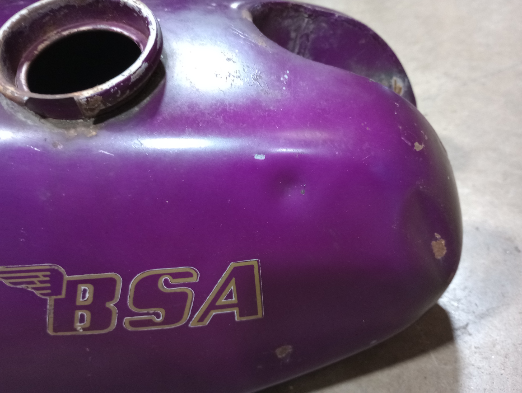 Original Paint 1972 BSA B50 Gas Tank. Steel tank. Has a few dents in the Right Hand Side shown in photos from some bad steering stops. There is a light layer of surface rust inside the tank.