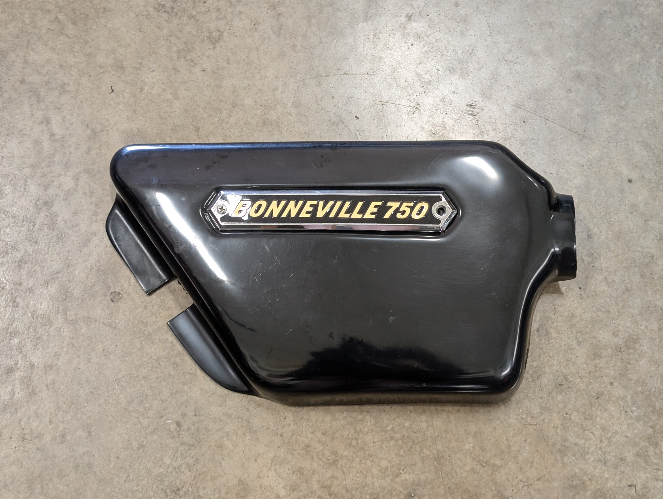 Genuine NOS right hand outer side cover for 1978 T140V with concentric carbs, includes decal and holder. Item is shelf worn with a few minor scuffs.