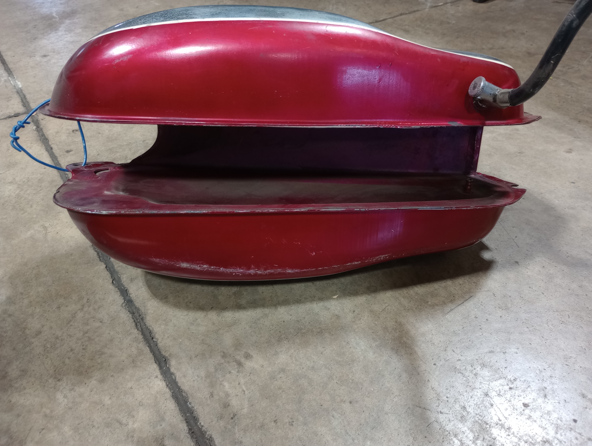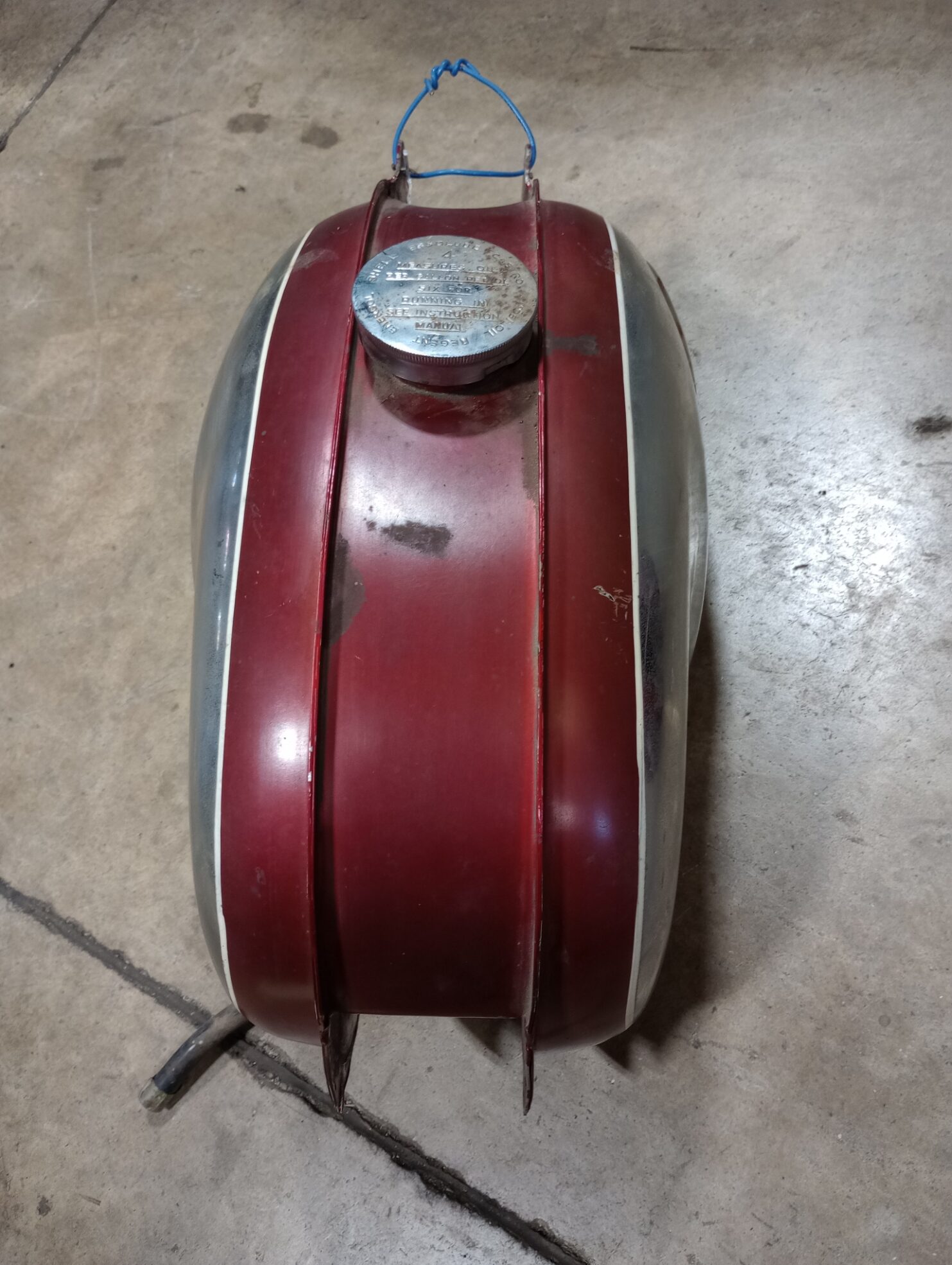 Nice Original paint gas tank with a few nicks and scuffs . I don’t see any dents paint and chrome will cleanup nice , for being 55+ years old. The inside clean and dry. Comes with gas cap that has measuring cup for oil.