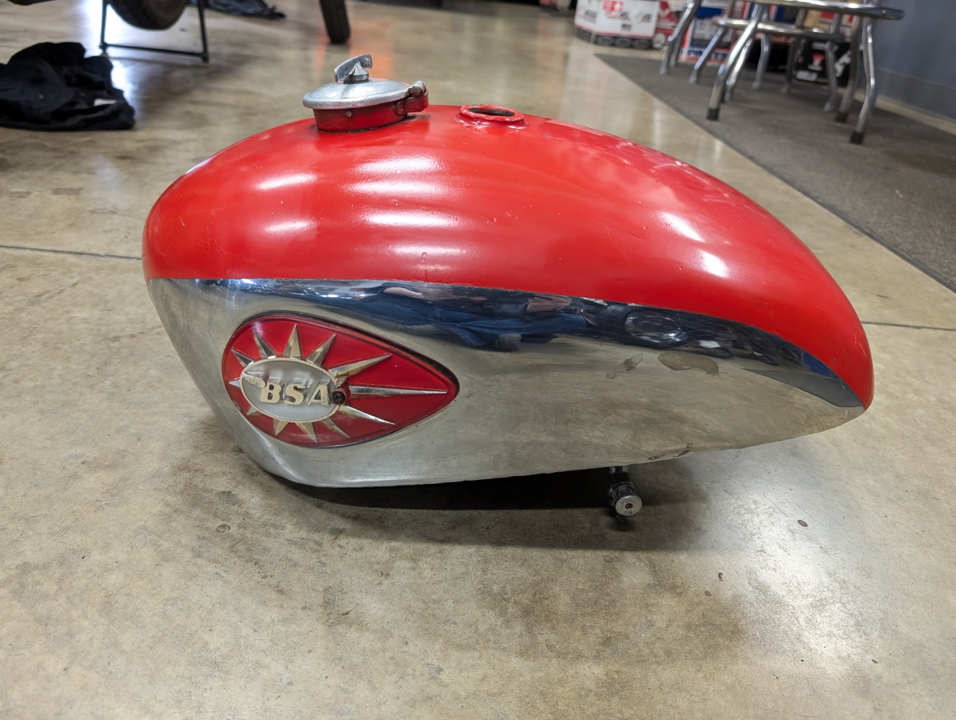 1966 BSA Lightning gas tank. Can be used on other models 1963-1970 A50/A65. Chrome is in very nice condition with a few light scratches. There is a blemish on the left hand side above petcock area. Comes with petcocks, badges, and gas cap as shown. Inside is very clean with a few spots of surface rust.